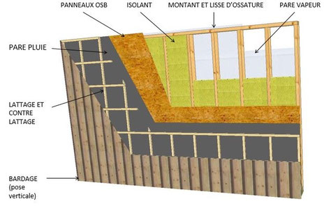 Pour assurer la stabilité, on fixe des panneaux de contreventement (comme l’OSB) sur l’ossature. Un pare-pluie est ensuite posé pour protéger la structure de l’humidité extérieure. Des tasseaux sont fixés au droit des montants pour créer une lame d’air ventilée, qui évite la condensation. Cette lame d’air se situe juste derrière le revêtement extérieur, qui peut être en bois, brique, enduit ou autre matériau.